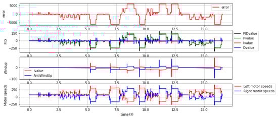 The performance of the PID control method is shown in Figure 24. For this experiment, the first track was used (Figure 23a). The figure illustrates the plots of the error, the output value of the PID with its terms P, I, and D, and the antiwindup effect over one lap of the track.