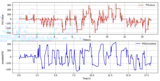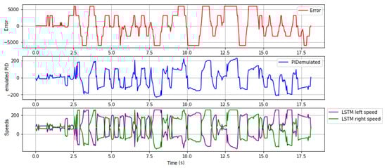 Figure 25 shows the results of the control with the LSTM network and the motor speeds on one lap of the track. The first plot displays the error in the infrared sensor readings, while the second plot shows the predictions generated by the LSTM network. Unlike the PID controller, where the new calculated value is added to or subtracted from the wheel speeds, the LSTM network directly outputs the wheel speeds. To compare the performance of both control methods, a reverse operation was performed: using the new wheel speeds, an approximate equivalent of the PID value was calculated. However, it is important to note that this approximation does not perfectly correspond to the actual PID value as the LSTM network is trained to emulate the behavior of the PID controller rather than replicate its calculations exactly. In fact, comparing the two control methods, we can see that both are quite similar, as shown in Figure 26. Although some similarities can be observed, the differences in the initial conditions and variations throughout the experiment, even when using the same path, lead to notable differences between the two experiments.