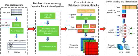 Unlike traditional methods, the proposed approach ensures both the accuracy of protocol recognition and eliminates the need for manual feature selection. The processing workflow of this method is illustrated in Figure 1.