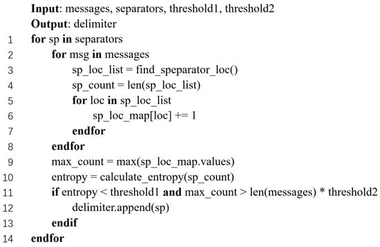 We propose an algorithm for determining delimiters based on information entropy. The algorithm traverses the 38 candidate delimiters, records the position and frequency of each delimiter in each network packet, and uses a map to store the frequency of occurrence of delimiters at a certain position. Then, the algorithm calculates the information entropy of delimiters based on their frequencies and retains the highest frequency of occurrence of delimiters at the same position. Finally, delimiters are judged on whether they can be considered optimal delimiters based on a threshold. The pseudocode of the algorithm is shown in Figure 2, where the threshold for information entropy is set to 2.5 according to reference [], and the threshold for frequency is empirically set to 0.3.