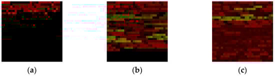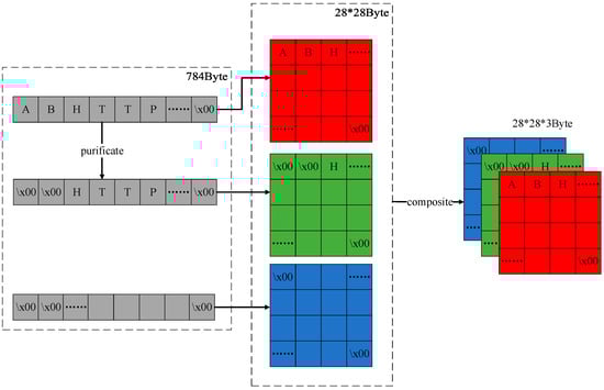Data transformation and composition entail converting each character to its corresponding numerical value in ASCII (ranging from 0x00 to 0xFF). The extracted 784 bytes of data are then transformed into a 28 × 28 × 1 matrix with an 8-bit depth. Subsequently, the original data matrix serves as an RGB image’s red (R) channel, while the purified data matrix serves as the green (G) channel. Finally, a 28 × 28 matrix consisting of “\x00”s is used as the blue (B) channel. As the valid data only exist in the red and green channels, the original data portion appears as an 8-bit depth red color, while the composite data portion exhibits an 8-bit depth red-green composite color, with the absence of data represented in black. The generated image is shown in Figure 4.