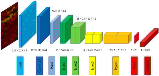 We utilize the pre-trained model of ResNet for protocol feature training and target classification recognition. ResNet is proposed by He [] in 2015. It is a deep convolutional neural network architecture. It addresses the issue of gradient vanishing that commonly occurs in traditional deep neural networks when increasing the network depth, leading to training difficulties or suboptimal performance. The ResNet18 network model is illustrated in Figure 5.