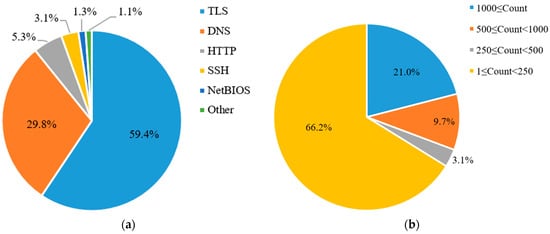 We developed a Python program using Shodan’s open API to search for application layer protocol names on Shodan and save the results locally. Leveraging the list of assigned port numbers maintained by IANA, application layer protocol names were filtered and deduplicated, resulting in a set of 2204 application layer protocol names. The protocols were categorized based on the volume of data for each protocol, as shown in Figure 6b. Among these, there are 463 protocols with data volumes exceeding 1000 samples each, with 1200 samples captured for each protocol, totaling 555,600 samples.