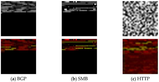 These six images show pictures generated from the same protocol using different algorithms. The first row displays images generated directly from the raw data, while the second row uses the algorithm proposed in this paper. (a) represents the BGP protocol, (b) represents SMB, and (c) represents HTTP.