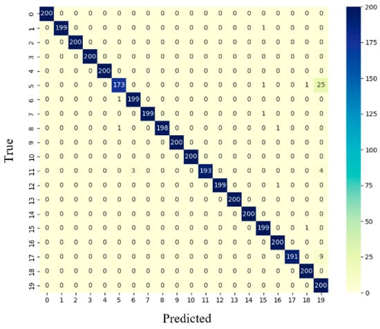 We selected the confusion matrix generated from the “our” group when tested on the ResNet50 model, as shown in Figure 9. From the data in the figure, it can be inferred that the primary factor affecting recognition accuracy currently is that some labels of HTTP protocol (label 5) are being identified as TLS (label 19).