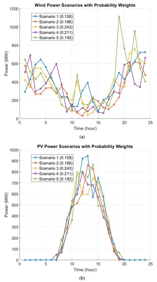 Given these advantages, this study adopts KDE with a Gaussian kernel function to generate 24 h probability density functions (PDFs) for wind and solar power outputs. The PDFs for the wind power output x and PV power output y at hour t are given by Equation (1):