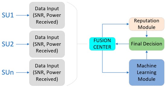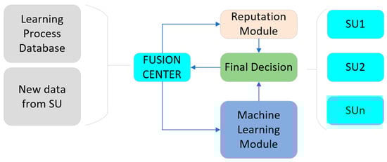 In the second part of the process, the fusion center starts to recognize the SSDF attacks based on the previous results of the training process and the new data obtained from the SUs. The reputation module dynamically adapts the results according to the latest data and gives a weight to each SU. Based on the two modules, an SU can be classified as an SSDF attacker, and its information starts to be irrelevant to the final decision. The final decision is transmitted to all SUs present in the environment, and weights are updated, as can be seen in Figure 2.