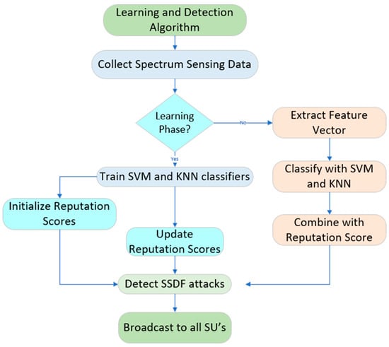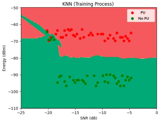 The proposed detection framework operates as a classification model within a supervised learning paradigm. Specifically, the SVM is employed to separate secondary users into two categories—honest or malicious—based on labeled training data that includes features such as SNR and received energy. Similarly, the KNN algorithm functions as an instance-based supervised classifier, assigning each new sensing report to the appropriate class by comparing it with previously labeled samples in the feature space.