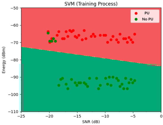 The SVM model is trained with PU values in the environment with different SNR values and positions. After this, SVM can detect the presence of the PU in normal conditions.