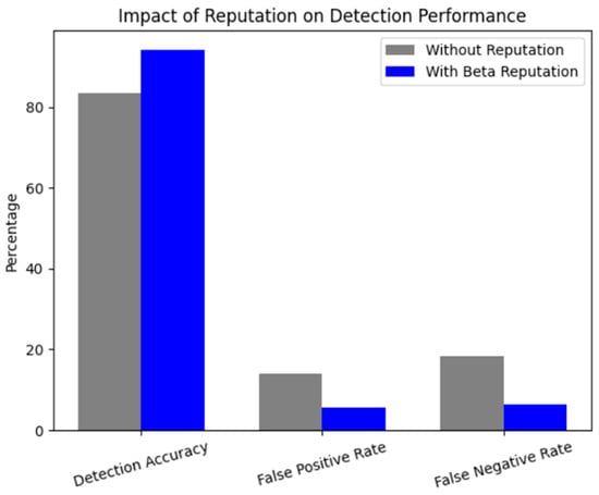 Collusion among malicious SUs can reduce the diversity of sensing reports and artificially reinforce false decisions, thereby increasing the difficulty of detection compared to independent attackers. Our hybrid model mitigates some of these challenges through the reputation-based weighting mechanism, which gradually penalizes nodes whose reports consistently diverge from the fusion center’s global decision. Even when colluding attackers share similar falsified reports, long-term discrepancies with the actual channel state reduce their reputation scores over multiple sensing rounds, limiting their influence on the final decision. However, if a sufficiently large coalition of attackers dominates the reporting set, they could temporarily skew the global decision before the reputation system has collected enough evidence to isolate them.