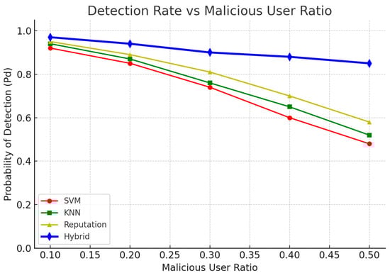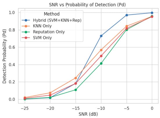 It shows that detection performance improves with increasing SNR. Among the methods, the Hybrid model consistently achieves the highest detection probability across SNR values. It outperforms individual model results under challenging low-SNR conditions, such as −15 dB and −10 dB, showing the ability to cross-validate user behavior using both real-time classifiers (SVM, KNN) and long-term reputation scores. These results reinforce the value of hybrid frameworks in dynamic environments where signal quality is variable and attackers may exploit low-SNR conditions to evade detection.