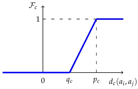 In a second step, these differences are transformed into mono-criterion preference indices . is a monotonically increasing preference function in . The exact forms of are left to the decision maker to decide. In [], however, the authors proposed 6 different types of preference functions that should reasonably satisfy most decision contexts. The so-called linear preference with an indifference threshold function, shown in Figure 1, is an example of a widely used function. In this case, the decision maker has to instantiate the values of two parameters, denoted and , which respectively represent an indifference and a strict preference threshold for criterion .