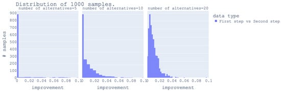 To better understand the number of cycles left after this basic transformation and the impact on the sum of pairwise preferences (), an empirical comparison between the sum after the first step and the sum after the second step was conducted. However, since finding cycles using DFS on artificial can be exponentially time-consuming, the tests were limited to at most 20 alternatives (as shown in the Figure 4). The data was randomly generated. First, a table of evaluation for n alternatives with k criteria each was generated with an uniform distribution. Then PROMETHEE II was applied with randomly generated weights (also uniformly distributed) and using the linear preference function (see Figure 1). For each criterion, the indifference threshold was fixed as the first quartile of all possible differences between alternatives on the given criterion. Similarly, the preference threshold was the third quartile of all differences. After conducting tests with varying numbers of criteria, the changes in the distribution were minor, so only one test was retained for this article and is displayed in Figure 4.