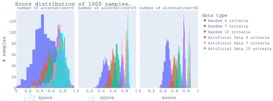 Tests on different numbers of criteria were conducted. The results shown in Figure 5 are fairly similar for a fixed number of criteria, regardless of the number of alternatives. The mode of each distribution is more or less the same value. From 5 alternatives to 25 alternatives, there is a large change in the width of each distribution. As the number of alternatives grows, the probability of having a well-ordered dataset (respectively, datasets with lots of cycles) decreases. This is due to the way the datasets are generated (each data point is uniformly distributed and its generation is independent from others). This is unrealistic when considering the field of MCDA, where there are, most of the time, dependence and conflict between criteria, and alternatives will never be uniformly distributed. For the artificial data, a random sampling on an initial 1000 alternatives was used to reach the 5, 25, and 50 alternatives of each distribution. As the sample is getting closer to the original number of alternatives, the distribution becomes narrower. The main takeaway from the artificial data is the high score it achieves (as it is an extreme case). However, this score is not 1 since a score of 1 would mean the net flow scores are all null (since it is the only way the sum of the pairwise preference can be null), and by the generation conducted, this is not achievable. Moreover, having all net flows score equal to zero is highly unrealistic as well.
