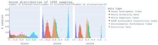 The ASEM dataset is the smallest, with only 51 alternatives. Both the Environmental Performance Index dataset and the World Happiness Report dataset are also fairly small with 105 alternatives and 137 alternatives, respectively. The Human Development Report has 190 alternatives. And, for the World University Rank, the number of alternatives is 1394, much larger than the rest. Due to the difference in size, the sampling is limited to at most 50 alternatives. To complete this distribution analysis, for all of those datasets, the final score can be computed and can be found in Table 1.