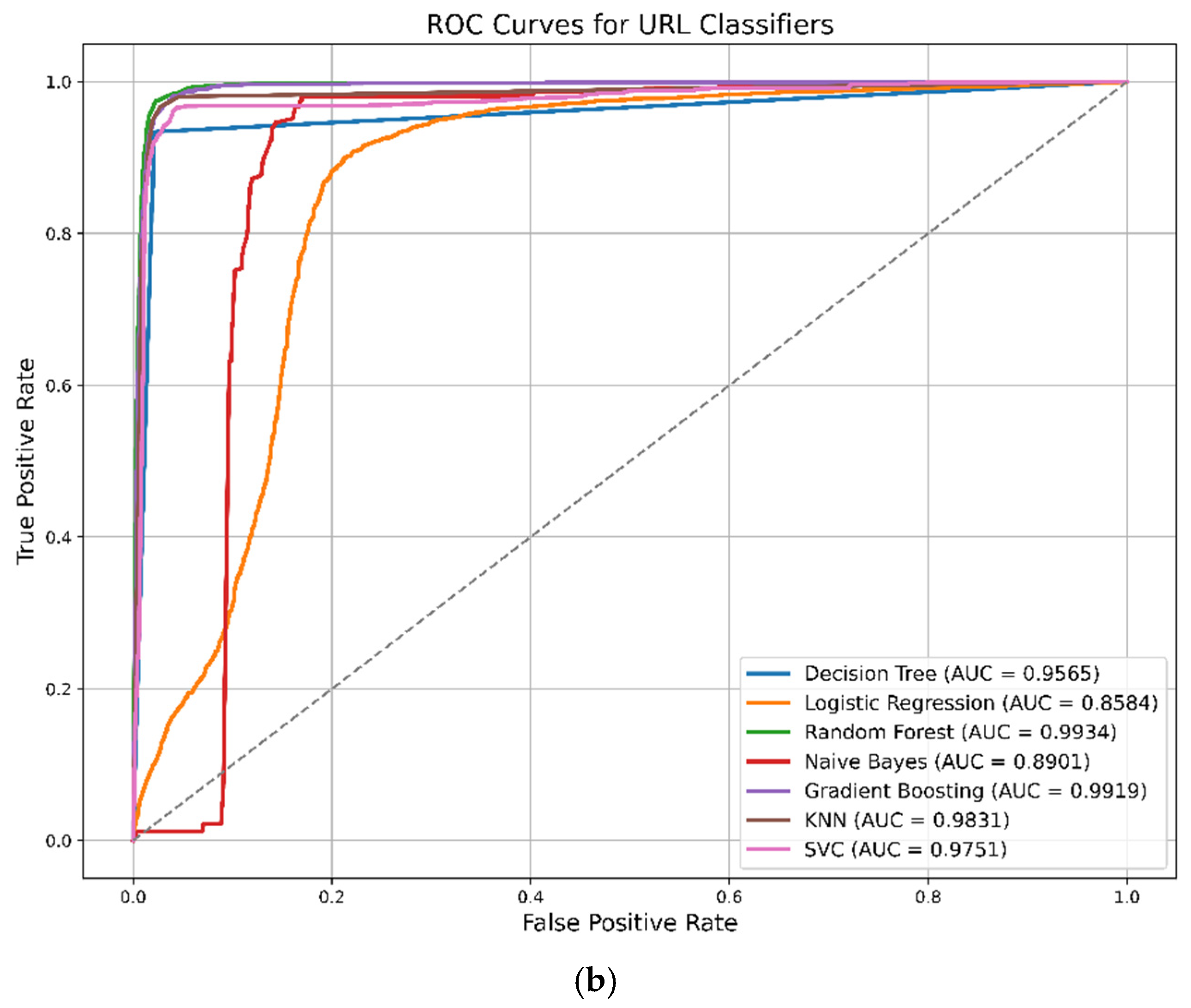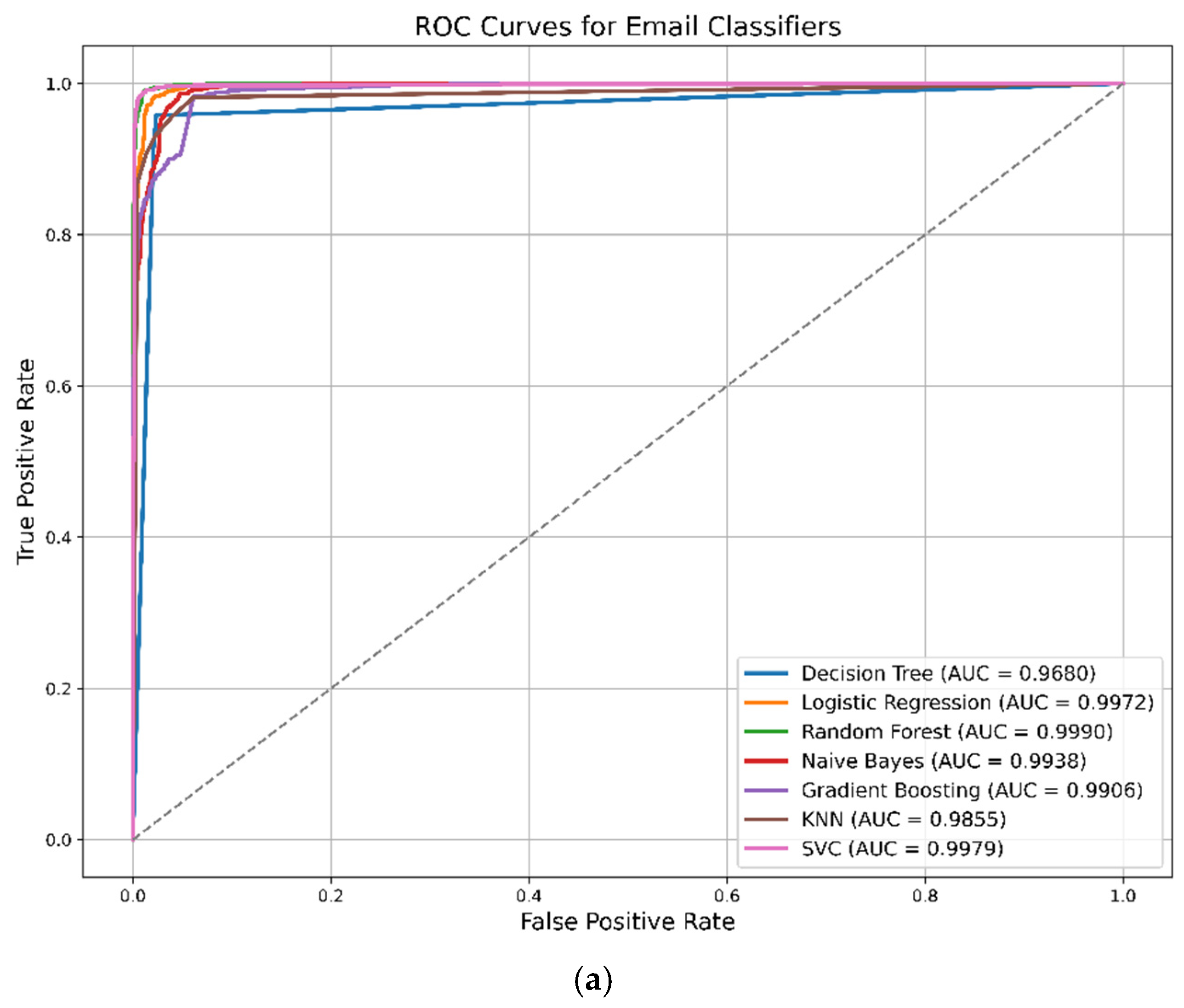 4.1.3. ROC Curves of ML Models on Email and URL Data