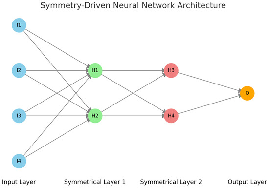 The proposed symmetry-driven neural network architecture, illustrated in Figure 1, integrates symmetrical properties within its layers to maximize both efficiency and security. By implementing weight-sharing across symmetrical layers, the design minimizes redundant operations and reduces computational demands. The training process is guided by a total loss function (Equation (1)), which balances prediction accuracy with a regularization term that enforces symmetry. This configuration is especially suited for E-government environments, where data handling requires robust security alongside optimal processing speed to meet high-performance standards.