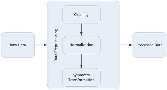 Data pre-processing pipeline, involving cleaning, normalization, and symmetry-driven transformations for each dataset type.