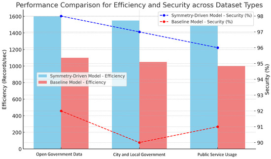 Performance comparison of the proposed symmetry-driven neural network versus baseline models across three datasets. The chart illustrates improvements in both efficiency (records/sec) and security (% of attacks prevented), highlighting consistent superiority of the symmetry-driven approach. The x-axis represents dataset categories, while the y-axes measure efficiency (records/sec) and security (%).