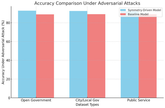 Accuracy comparison under adversarial attacks across three dataset types (Open Government Data, City and Local Government, Public Service Usage). The symmetry-driven model shows significantly less degradation compared to baseline networks.