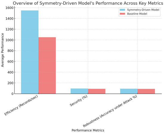 Overview of the symmetry-driven model’s performance across key metrics (Efficiency, Security, Robustness). Efficiency is measured in records/sec, Security in %, and Robustness as accuracy under attack conditions.