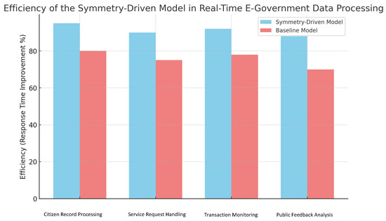Efficiency of the symmetry-driven model in real-time E-government data processing. Task-based categories: Citizen Record Processing, Service Request Handling, Transaction Monitoring, and Public Feedback Analysis. Efficiency is measured as response time improvement (%).