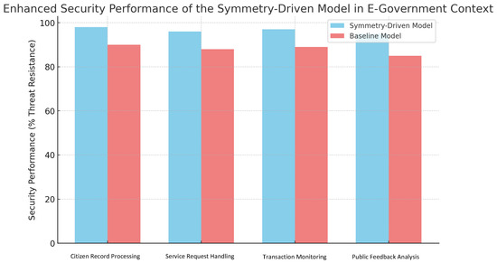 Enhanced security performance of the symmetry-driven model in an E-government context across task-based categories (Citizen Record Processing, Service Request Handling, Transaction Monitoring, Public Feedback Analysis). Security performance is measured as threat resistance (%).