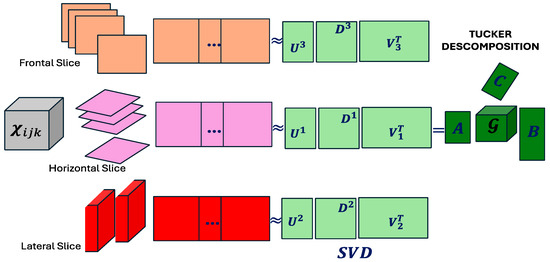 where is the core tensor that encapsulates the interactions among latent components, and are the loading matrices associated with each tensor mode. The operator denotes the mode-n product, which projects the original tensor onto the respective latent dimensions [1].