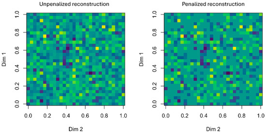 Comparative visualization between Tucker (unpenalized, left) and CenetTucker (penalized, right) reconstructions. Colors represent the magnitude of reconstructed values, with lighter shades indicating higher intensities and darker shades representing lower ones. The penalized reconstruction exhibits sparser and more structured patterns compared to the dense solution of the classical Tucker model. (produced by the authors).
