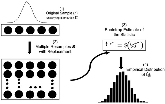 Schematic representation of the classical bootstrap procedure. (1) An original sample of size n is drawn from the underlying distribution F. (2) Multiple bootstrap resamples (B) are generated with replacement from the original sample. (3) A bootstrap estimate of the statistic, , is computed for each resample. (4) The empirical distribution of the bootstrap replicates is then used to approximate the sampling distribution of the statistic.