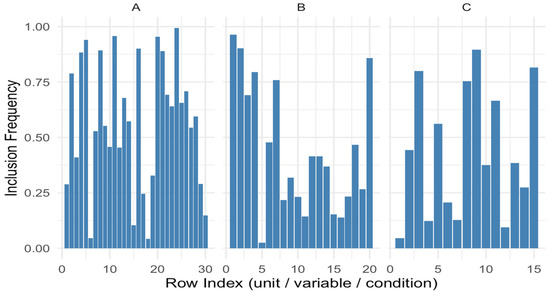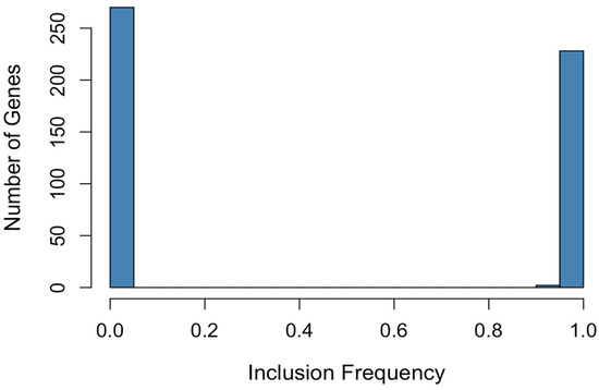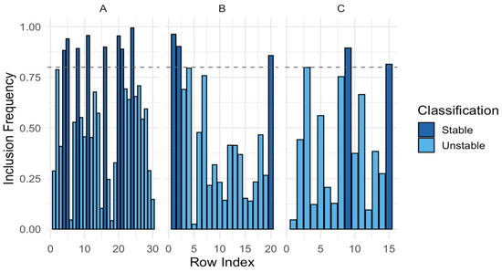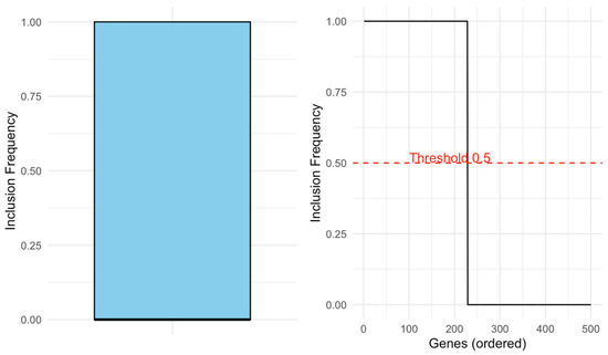To address this instability, ref. [11] introduced Stability Selection, a methodological innovation that leverages bootstrap resampling to compute empirical selection probabilities for each variable. Letting denote the estimated selection probability for variable , defined as: