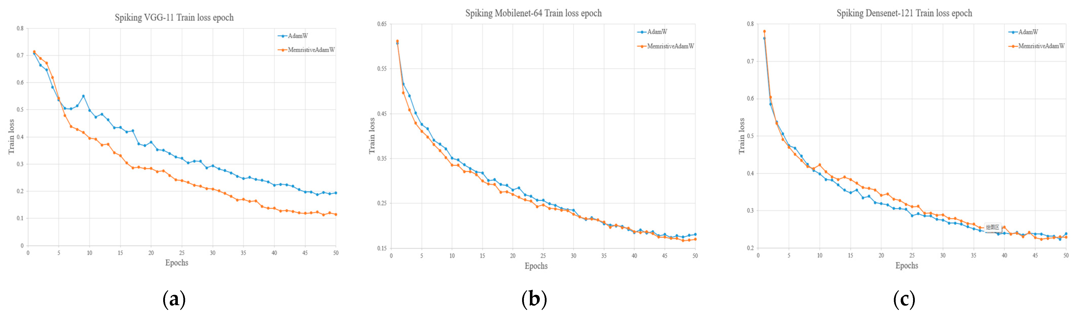 The experimental results show that MemristiveAdamW outperforms the baseline AdamW algorithm in most network configurations. In the case of the Spiking VGG-11 model, MemristiveAdamW demonstrates significant improvements over AdamW: the training loss is reduced from 0.187 to 0.115, and the classification accuracy increases from 92.68% to 95.72%. Both the convergence speed and final performance exhibit clear advantages. This performance gain is mainly attributed to the direction-aware gradient modulation mechanism introduced in MemristiveAdamW, which dynamically adjusts the learning rate direction by analyzing the trend of consecutive gradients. Combined with memristor-inspired perturbation modeling, the algorithm enhances exploration during early training, leading to faster convergence and more stable updates. In the Spiking MobileNet-64 model, MemristiveAdamW also achieves modest improvements, reducing training loss from 0.181 to 0.170, and improving accuracy from 93.05% to 93.49%. This suggests that the algorithm remains robust even in lightweight models, potentially due to the fewer residual connections in Spiking MobileNet-64, which help maintain controlled gradient flow—enabling both the direction-aware and perturbation mechanisms to function effectively. However, in the Spiking DenseNet-121 model, the performance of the two algorithms is nearly identical. The training loss remains at 0.224 for both, and the accuracy slightly decreases from 91.27% (AdamW) to 91.23% (MemristiveAdamW). This suggests that the benefits of MemristiveAdamW may diminish in more complex network architectures such as DenseNet-121. DenseNet aggregates features through extensive shortcut connections, which inherently stabilize gradient propagation and mitigate vanishing gradients. While this property is generally beneficial, it also leads to a high degree of gradient redundancy. When MemristiveAdamW is applied in this context, the added modulation may no longer provide complementary regularization. Instead, it can amplify minor gradient inconsistencies across the densely connected layers, resulting in oscillatory or less stable convergence.