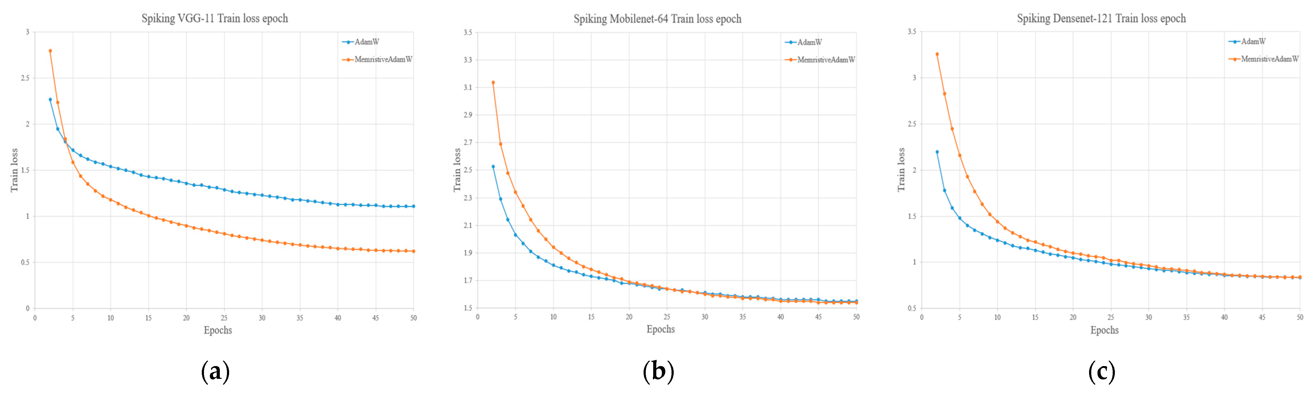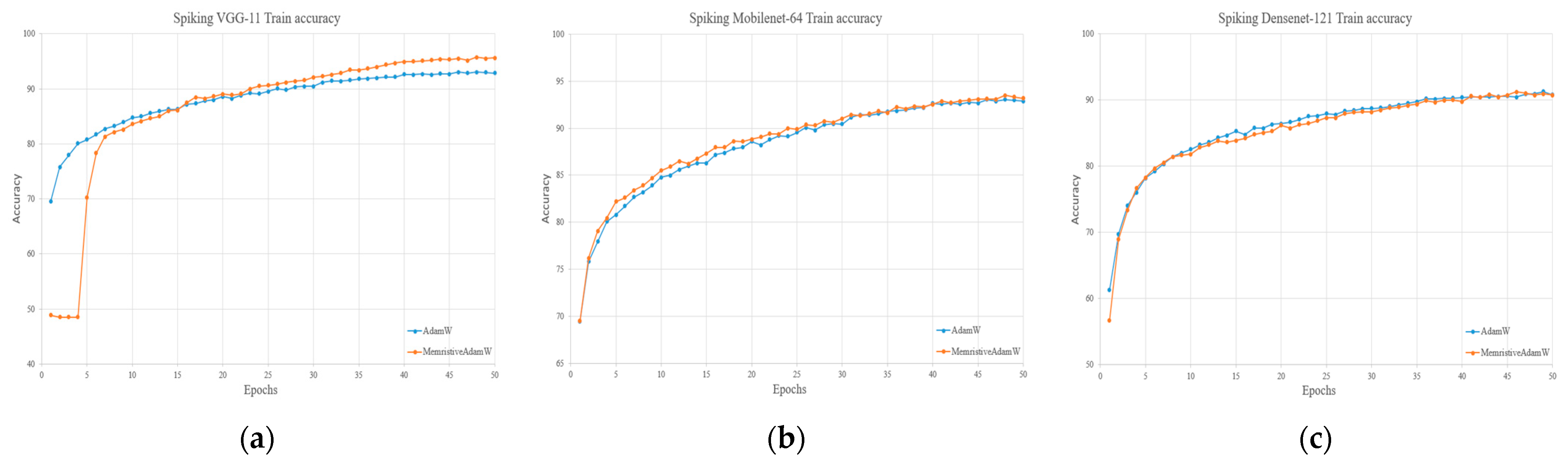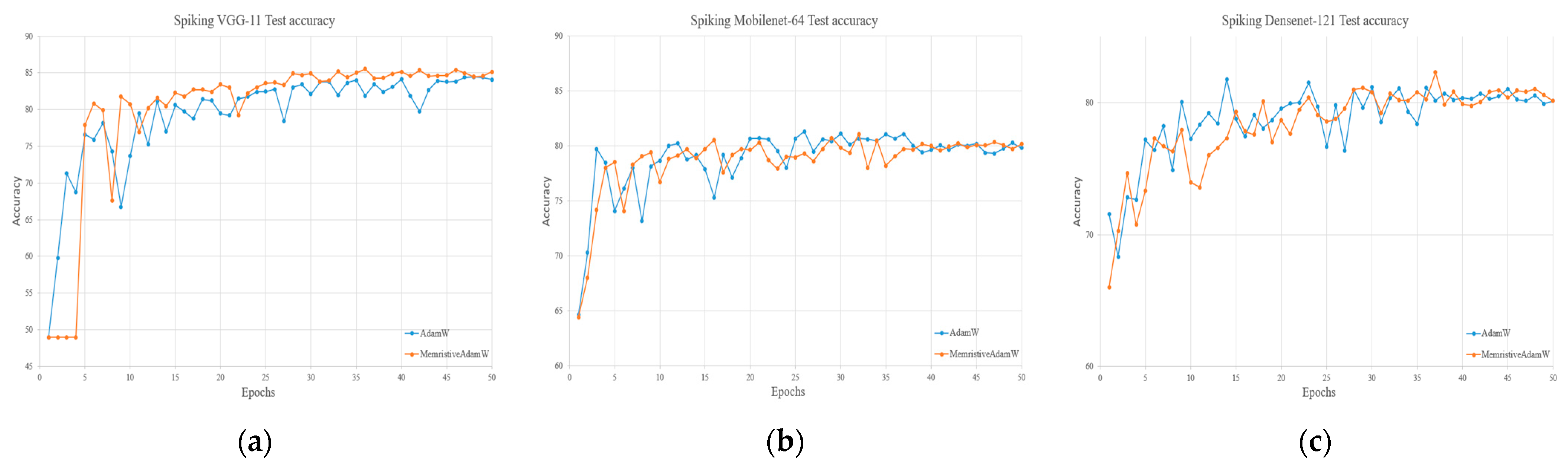 Neural Network Models: To validate the effectiveness of the proposed MemristiveAdamW algorithm, experiments were conducted on three representative SNN architectures: Spiking VGG-11, Spiking MobileNet-64, and Spiking DenseNet-121. These models differ in architectural depth and computational complexity, allowing a comprehensive comparison of the convergence behavior and final accuracy between MemristiveAdamW and the baseline AdamW.