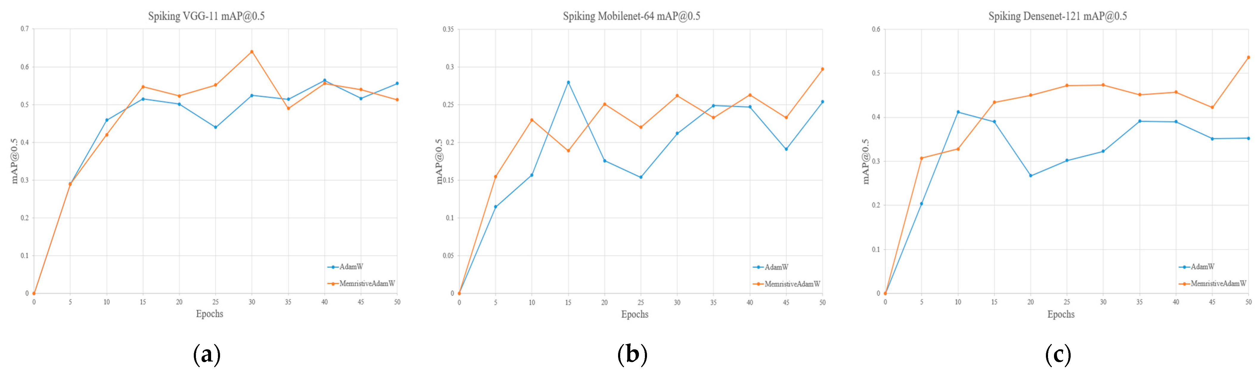 Figure 8 present the loss curves and mAP@0.5 curves during training across different network architectures for both optimization algorithms. In the Spiking VGG-11 model, the AdamW algorithm achieved a minimum training loss of 1.11 and a best mAP@0.5 of 0.564. In contrast, MemristiveAdamW significantly reduced the training loss to 0.625, while also achieving a higher detection accuracy, with mAP@0.5 improved to 0.640. These results indicate that MemristiveAdamW substantially enhanced convergence and object detection performance for this architecture. The performance gain can be attributed to the algorithm’s effective response to gradient fluctuations through its memristor-inspired perturbation mechanism. This dynamic adjustment mechanism is particularly effective under the highly sparse and volatile gradients commonly encountered in event-driven data, accelerating convergence in such conditions. For the Spiking MobileNet-64 model, the minimum training losses achieved by AdamW and MemristiveAdamW were 1.55 and 1.54, respectively—showing only a slight difference. However, MemristiveAdamW still provided better detection performance, improving mAP@0.5 from 0.280 to 0.297, suggesting that the proposed method offers performance advantages even in lightweight architectures. In the Spiking DenseNet-121 model, both algorithms achieved the same minimum training loss of 0.838, but MemristiveAdamW significantly outperformed AdamW in detection accuracy, with mAP@0.5 reaching 0.536, compared to 0.412 with AdamW. This result demonstrates that MemristiveAdamW can effectively enhance generalization and detection performance in deep network structures. In more complex and realistic event-based detection tasks, the synergy between the perturbation mechanism and the direction-aware adjustment contributes to overcoming the limitations of standard AdamW, particularly in handling intricate target recognition scenarios.