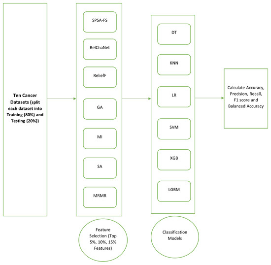 As illustrated in Figure 1, all ten cancer datasets were first divided into training (80%) and testing (20%) subsets. Feature selection was performed only on the training data using all seven feature selection methods. From each training set, the top 5%, 10%, and 15% of features were selected, resulting in 30 reduced feature subsets across all datasets. These selected feature subsets were then applied to the corresponding test sets. Next, classification models were trained on the reduced training sets and evaluated on the held-out test sets. Performance was assessed using Accuracy, Precision, Recall, F1 Score, and Balanced Accuracy.