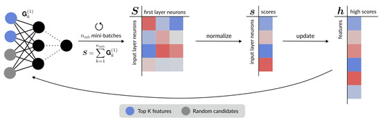 The input layer size is calculated as the number of selected features K plus . First, we choose the features randomly to populate the input layer; then, we start training the neural network that runs for mini-batches. The first-layer gradients are aggregated by addition. These gradient sums are normalized later, which results in a relative change score , which is calculated by Equation (8).