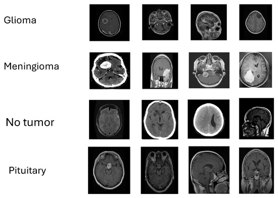 Representative MRI slices from the four study classes—glioma, meningioma, pituitary tumor, and no tumor—illustrating appearance variability used for validation.