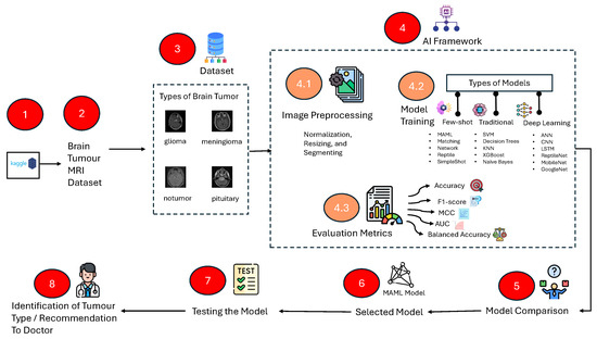 Few-shot learning models, like Prototypical Networks and Matching Networks, were constructed to meet the difficulty of minimal annotated data. These models were implemented with the Adam optimizer and particular loss functions including negative log-likelihood loss and cross-entropy loss to increase performance in low-data scenarios. Meta-learning models like MAML and Reptile enhanced learning efficiency and adaptability over numerous tasks by employing tactics like gradient updates and quick adaptation. The Model-Agnostic Meta-Learning (MAML) approach, utilized in this work, is based on a Convolutional Neural Network (CNN). The CNN architecture starts with an input layer optimized to receive 64 × 64 grayscale images. Layers of convolution and Max Pooling then assist in extracting hierarchical features. The architecture features a Conv2D layer with 32 filters and a (3 × 3) kernel followed by a Max Pooling 2D layer. This pattern is repeated with another Conv2D layer comprising 64 filters followed by another Max Pooling 2D layer. The recovered characteristics are then flattened and sent via a dense layer with 128 neurons triggered by ReLU before reaching the output layer with a softmax activation function to classify the input into one of four categories: pituitary, no tumor, meningioma, and glioma.