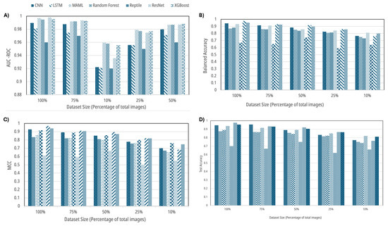- Data splits: Models were trained on identical training/validation/test splits across dataset sizes (100%, 75%, 50%, 25%, 10%) to ensure comparability.