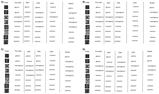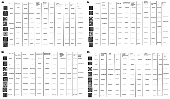 Representative classifications by traditional machine learning models across data regimes: (A) 10%, (B) 50%, (C) 75%, and (D) 100%; SVM and Random Forest improve with more data but show early confusion of “no tumor” with pituitary.