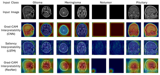 CNN Grad-CAM maps (Figure 8) show that for glioma and meningioma, the network attends to tumor regions, validating correct classifications. However, in the 10% dataset case, CNN activations for “no tumor” images often overlap with the pituitary region, leading to false positives for pituitary tumors. ResNet Grad-CAM maps similarly highlight tumor regions with stronger localization consistency than the CNN. LSTM saliency maps indicate temporal activation patterns but show greater dispersion, suggesting less precise localization.