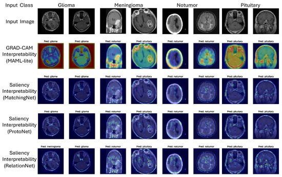 MAML-lite Grad-CAM results (Figure 9) reveal strong attention to tumor regions in correctly classified glioma images, but in some “no tumor” cases, activations shifted toward the pituitary region, explaining observed confusion. MatchingNet saliency maps occasionally emphasized background structures, contributing to errors in meningioma cases (Figure 9). ProtoNet saliency visualizations highlighted correct tumor regions in glioma but sometimes misfocused on meningioma areas, leading to cross-class misclassifications (Figure 9).