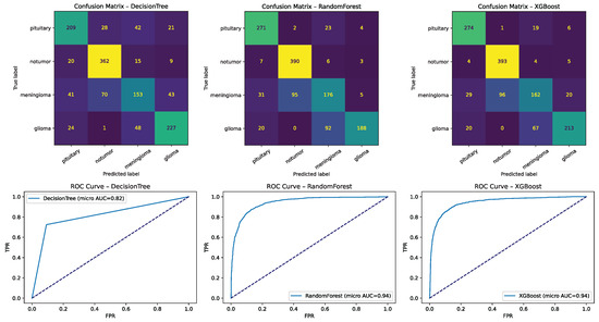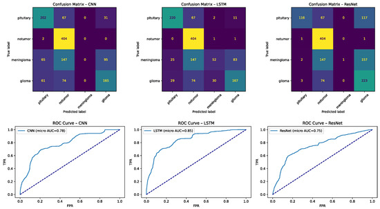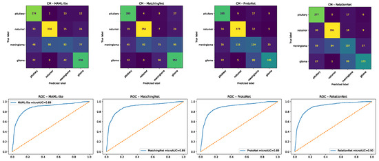 To provide deeper insight into model behavior, we analyzed per-class performance using confusion matrices and ROC curves. Confusion matrices for CNN, LSTM, MAML-lite, traditional ML methods, and MatchingNet are provided in Figure 10 and Figure 11. Similarly, confusion matrices for some representative traditional machine learning methods are shown in Figure 12. These illustrate per-class classification performance and highlight systematic misclassifications. For example, the CNN tended to confuse “no tumor” with “pituitary tumor” (61 cases), whereas MAML-lite showed more balanced predictions across classes.