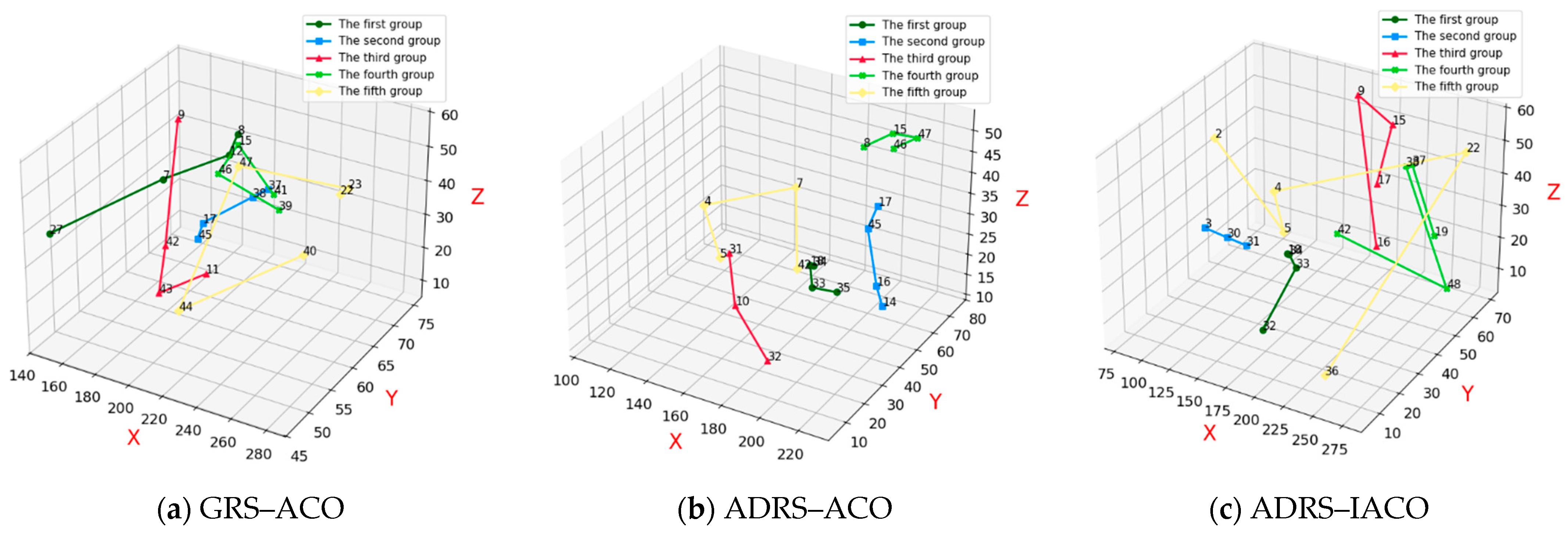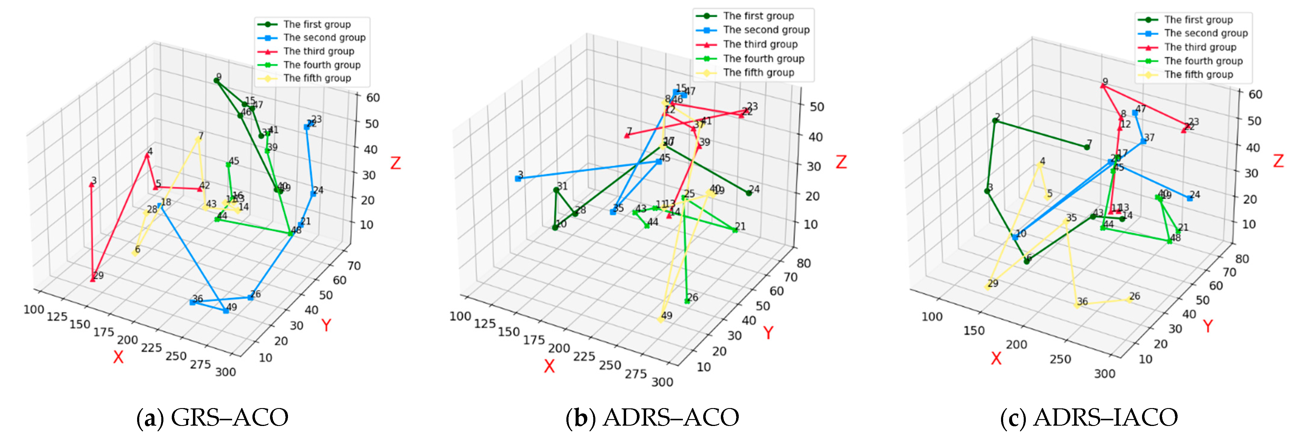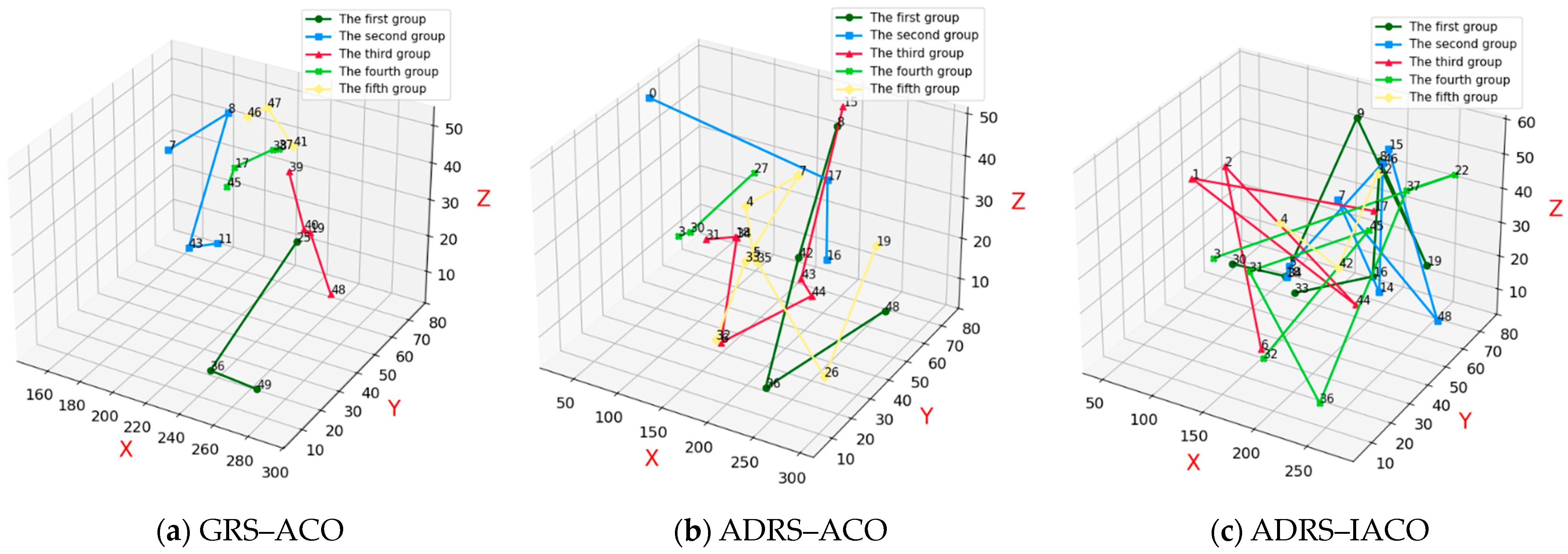 Figure 13a presents the repair and recovery paths obtained using the GRS-ACO. The combat equipment associated with the current UAV swarm combat scenario includes equipment 14, 12, 11, 13, 27, and 28, totaling six.