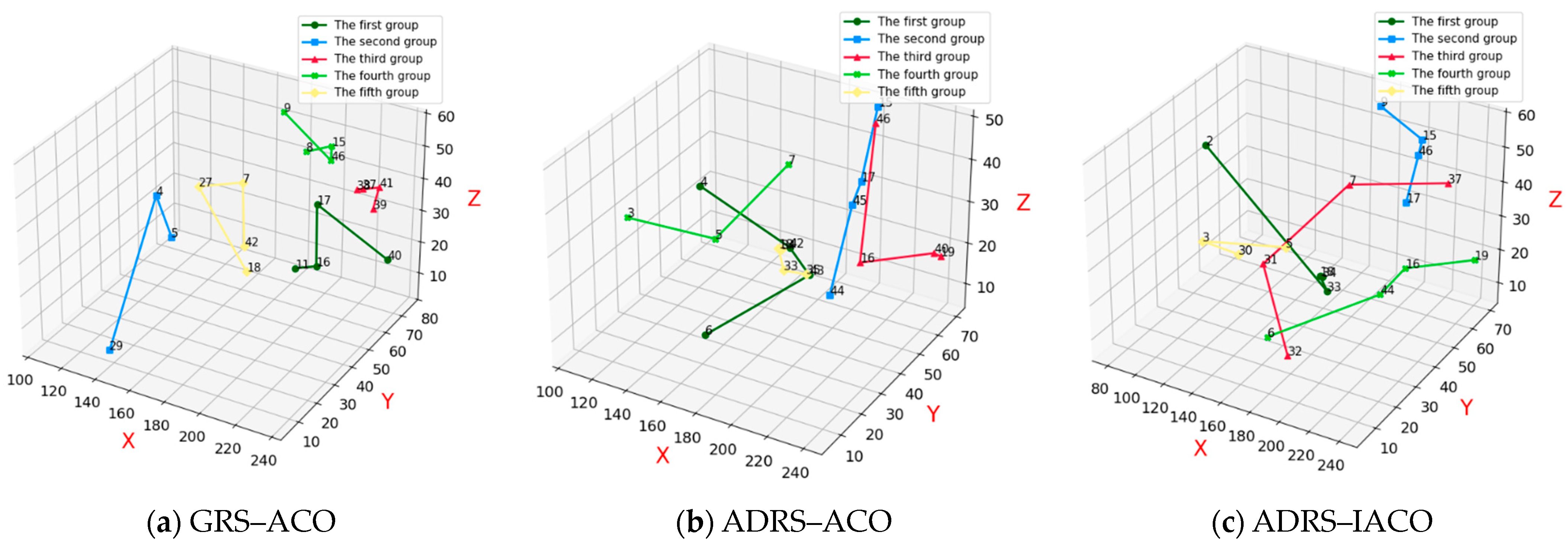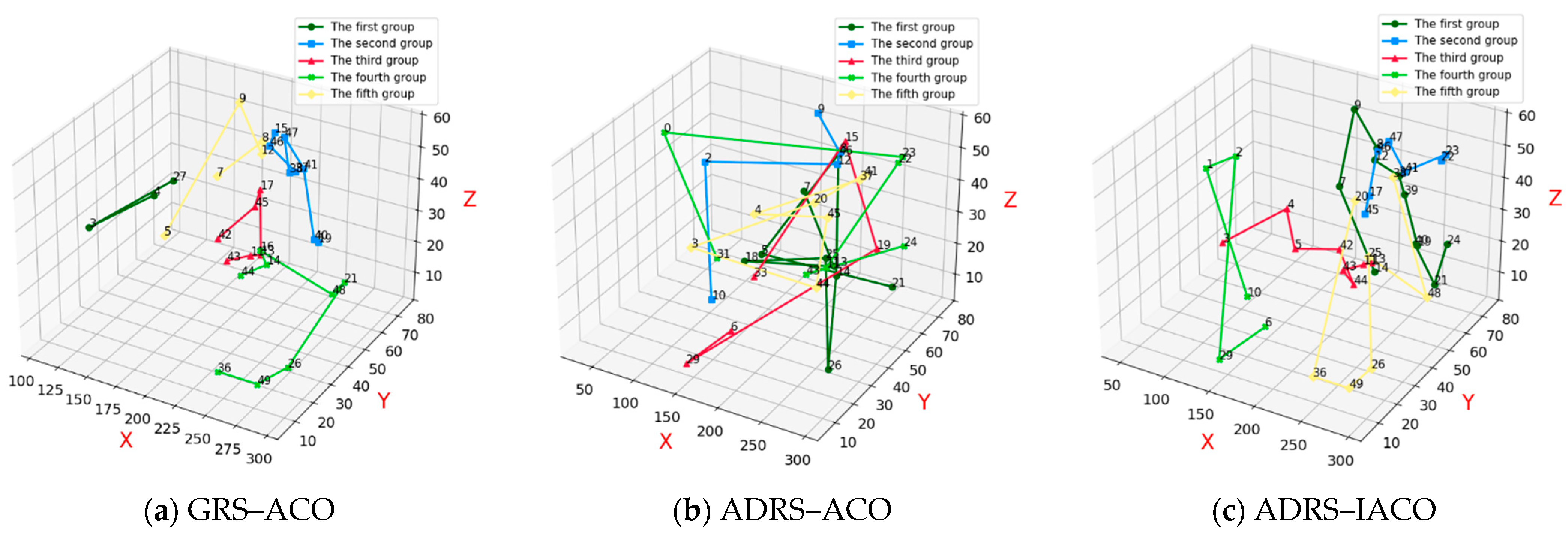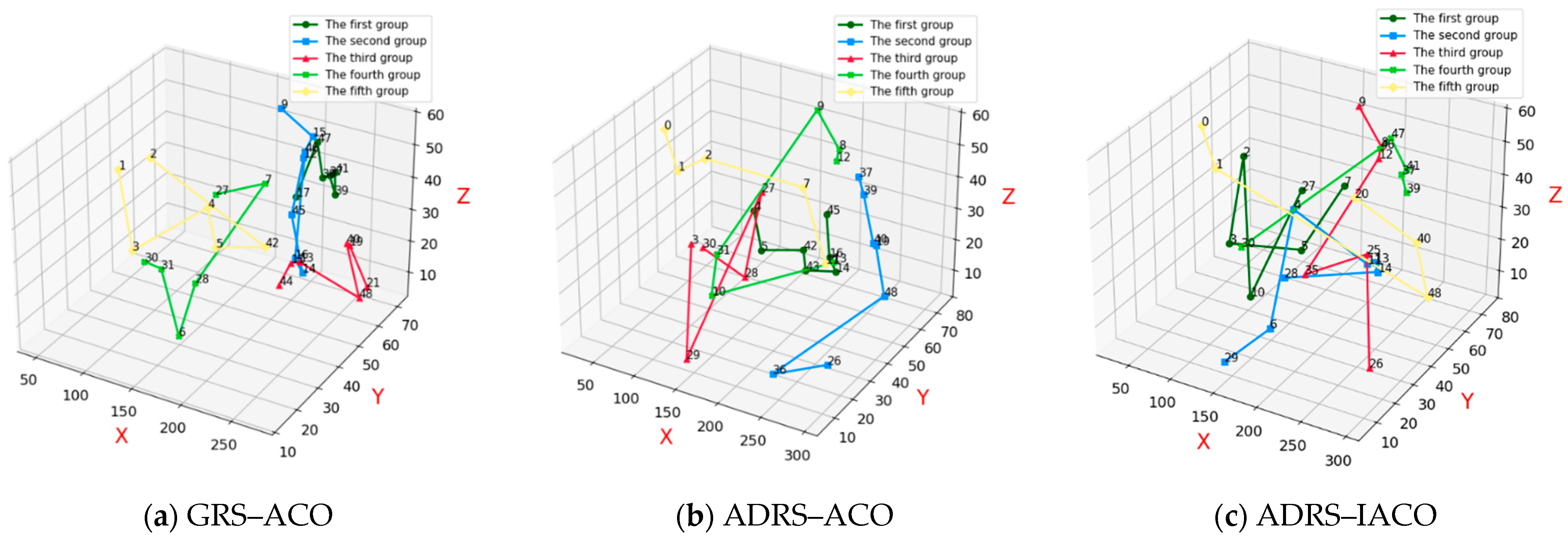 Figure 13a presents the repair and recovery paths obtained using the GRS-ACO. The combat equipment associated with the current UAV swarm combat scenario includes equipment 14, 12, 11, 13, 27, and 28, totaling six.