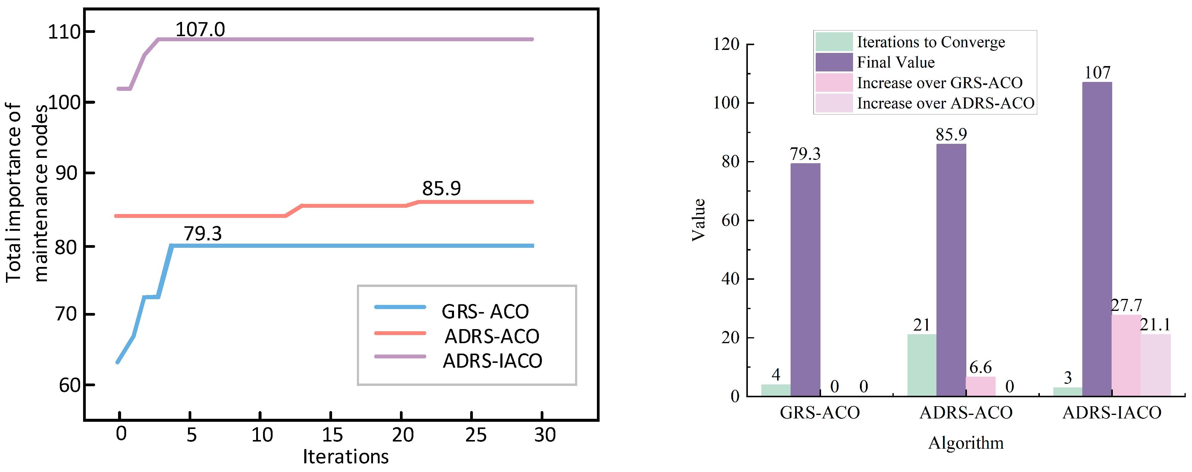 Table 2, the light-blue line represents the iterative process of the objective function of the GRS-ACO, converging to a final solution of 79.3 at the 4th iteration. The light-red line represents the iterative process of the ADRS-ACO, converging to a Final Solution of 85.9 at the 21st iteration. The light-purple line illustrates the iterative process of the ADRS-IACO, converging to a Final Solution of 107 at the 3rd iteration.