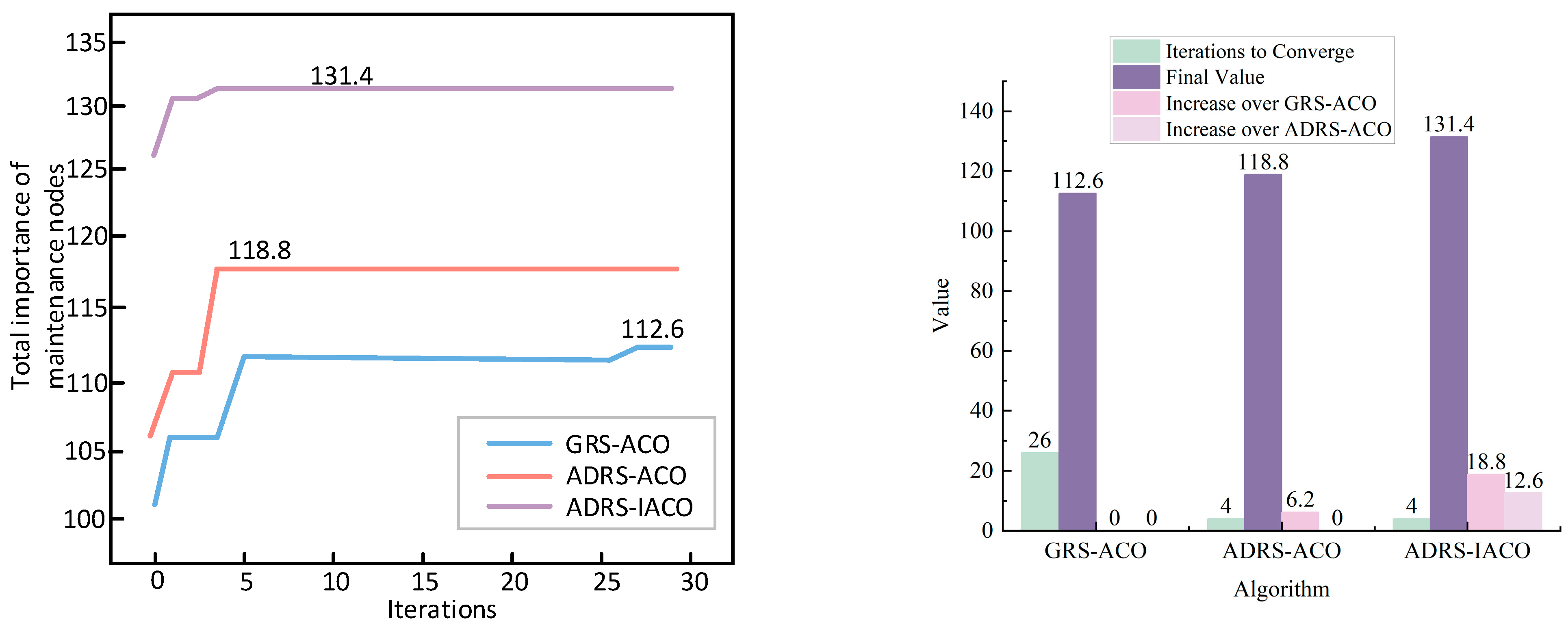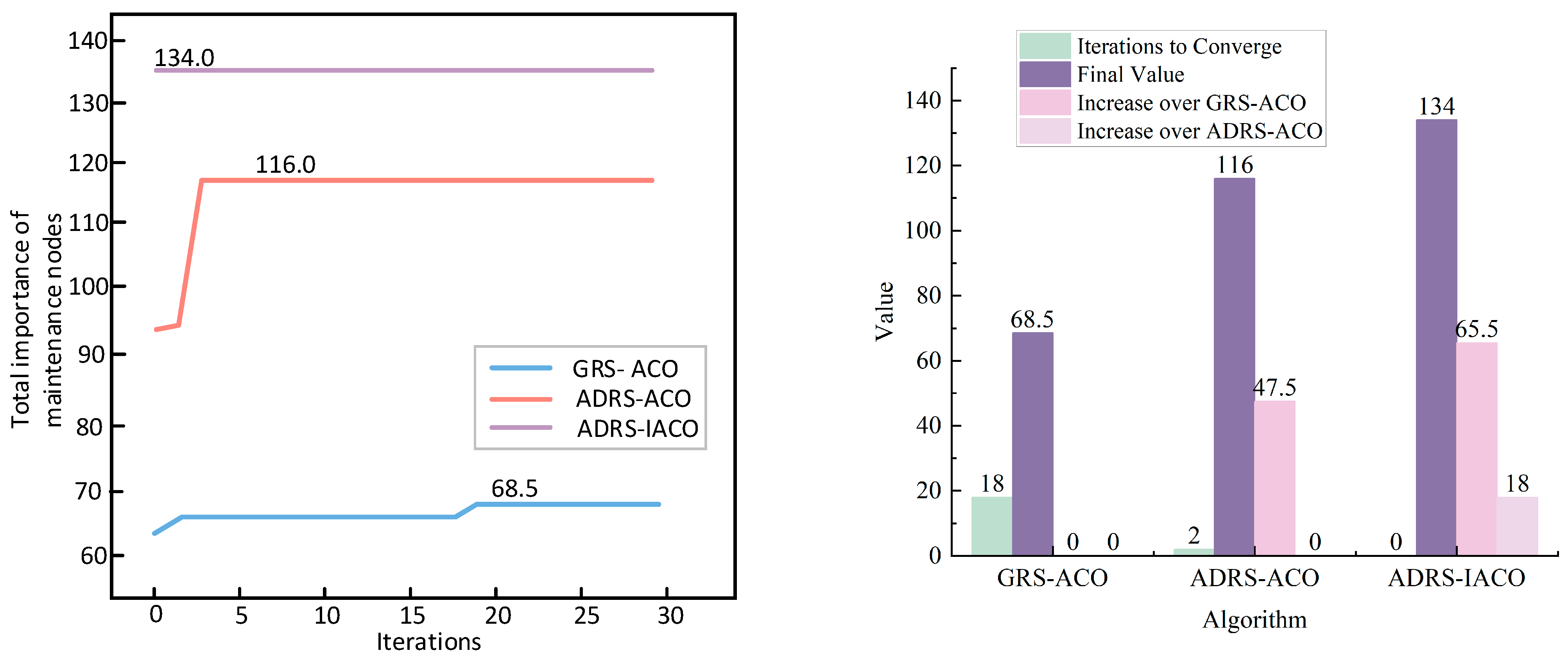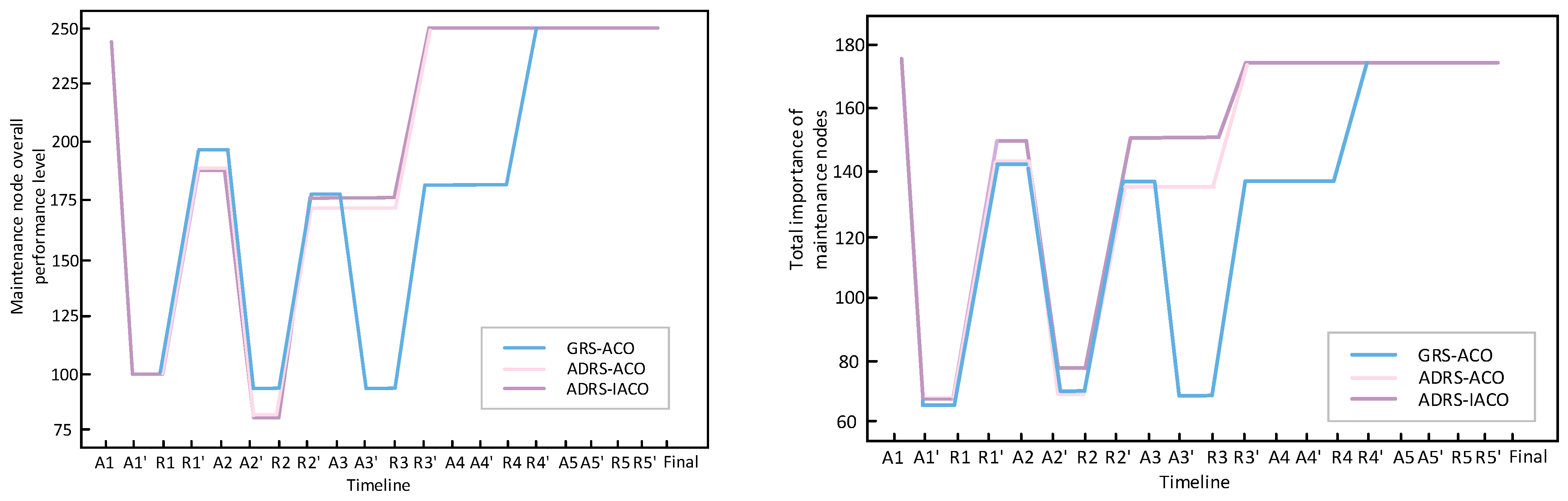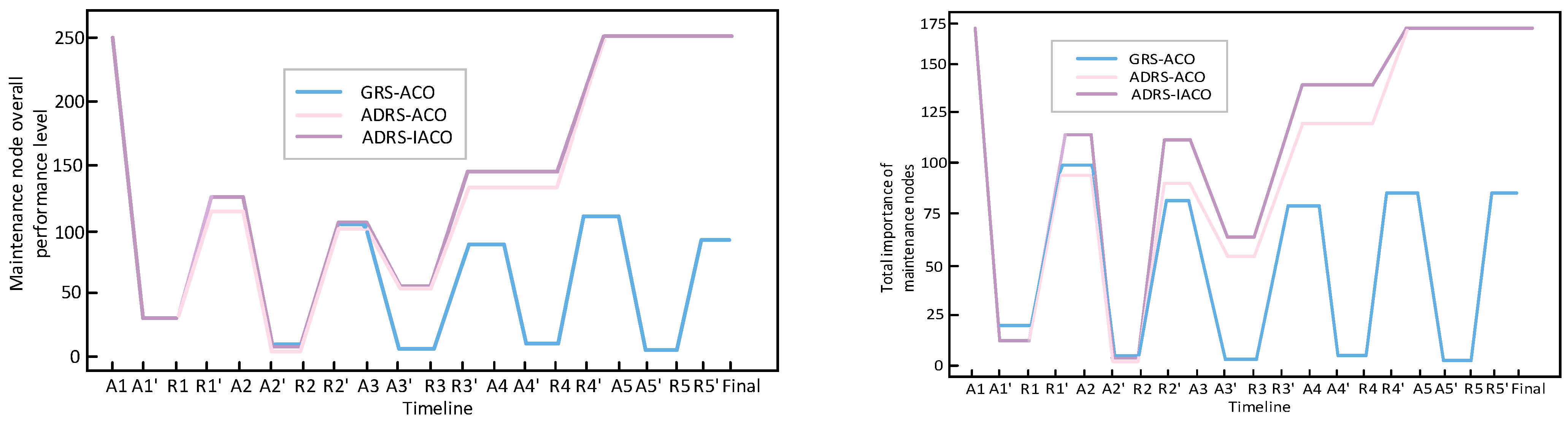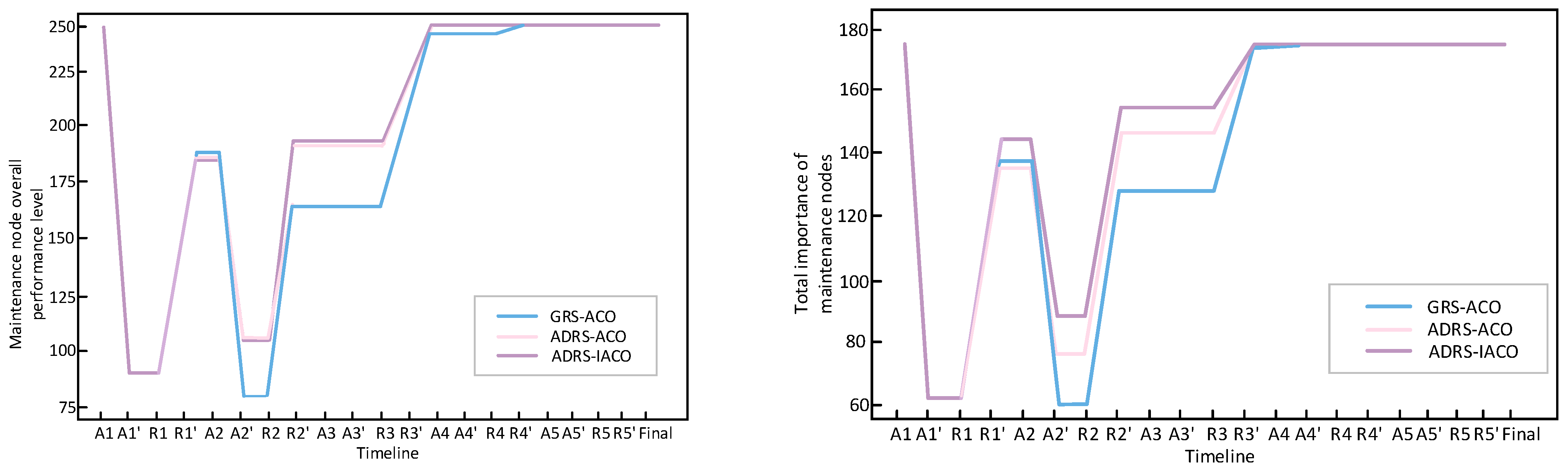 Moreover, in the experimental group based on ADRS in the left figure, the purple and pink lines basically overlap. However, in the right figure, the purple line in the maintenance R*-R*′ of each wave is also improved compared to the pink line, indicating that although the IACO and the ACO can repair about the same number of nodes in multi-constraint maintenance tasks, the IACO has stronger optimization ability for the objective function.