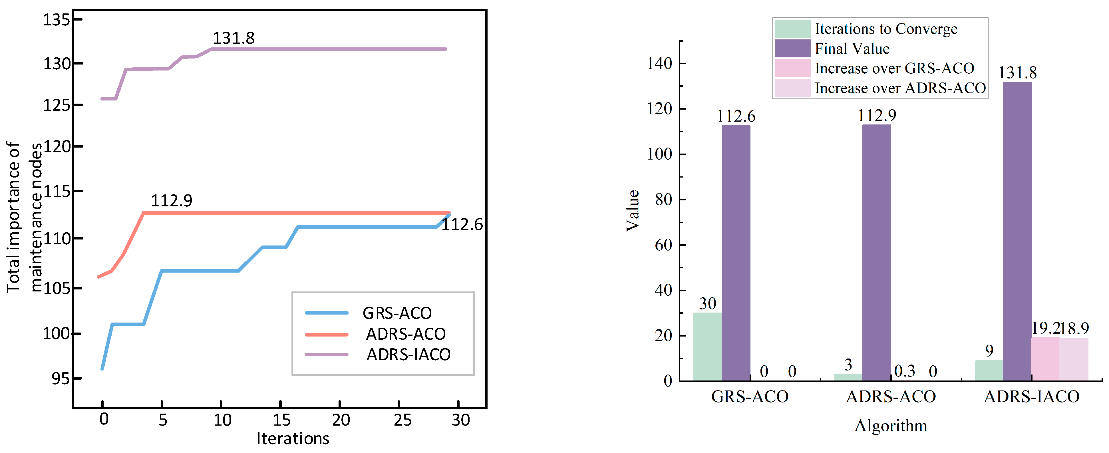 Table 5, the light-blue curve represents the iteration process of the GRS-ACO, with the objective function reaching 112.6 at generation 30. The light-red curve corresponds to the ADRS-ACO, which converges to 112.9 at generation 3. The light-purple curve represents the ADRS-IACO, with the objective function converging to 131.8 at generation 9. These results clearly indicate that the IACO demonstrates significantly stronger optimization capability than the traditional ACO, enabling the prioritized repair of combat equipment and more effective enhancement of the objective function.