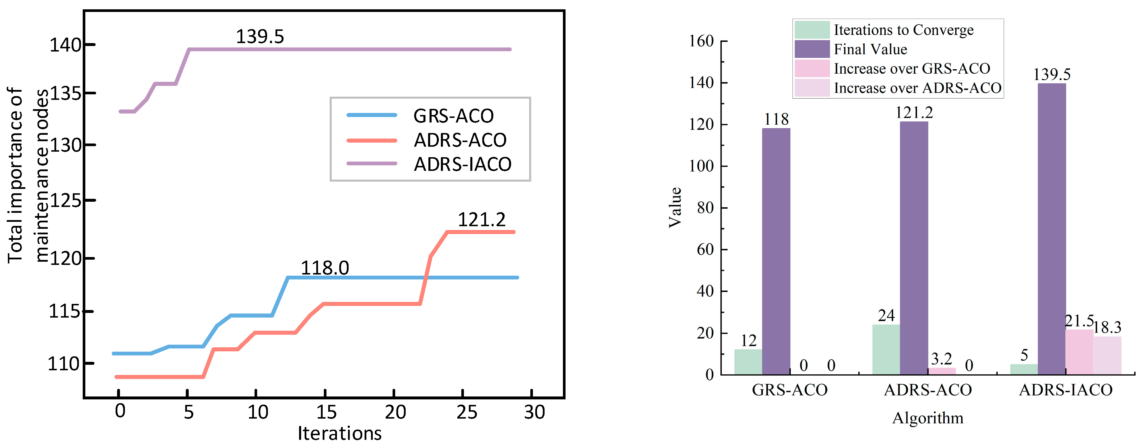 Table 8, the light-blue curve represents the iteration process of the GRS-ACO, with the objective function reaching 118 at generation 12. The light-red curve corresponds to the ADRS-ACO, which converges to 121.2 at generation 24. Although the objective value remained relatively low during the early stages, it eventually surpassed that of the GRS-ACO, driven by the influence of ADRS in prioritizing equipment with high wartime importance. The light-purple curve represents the ADRS-IACO, which converges at generation 5, with a final objective function value of 139.5.