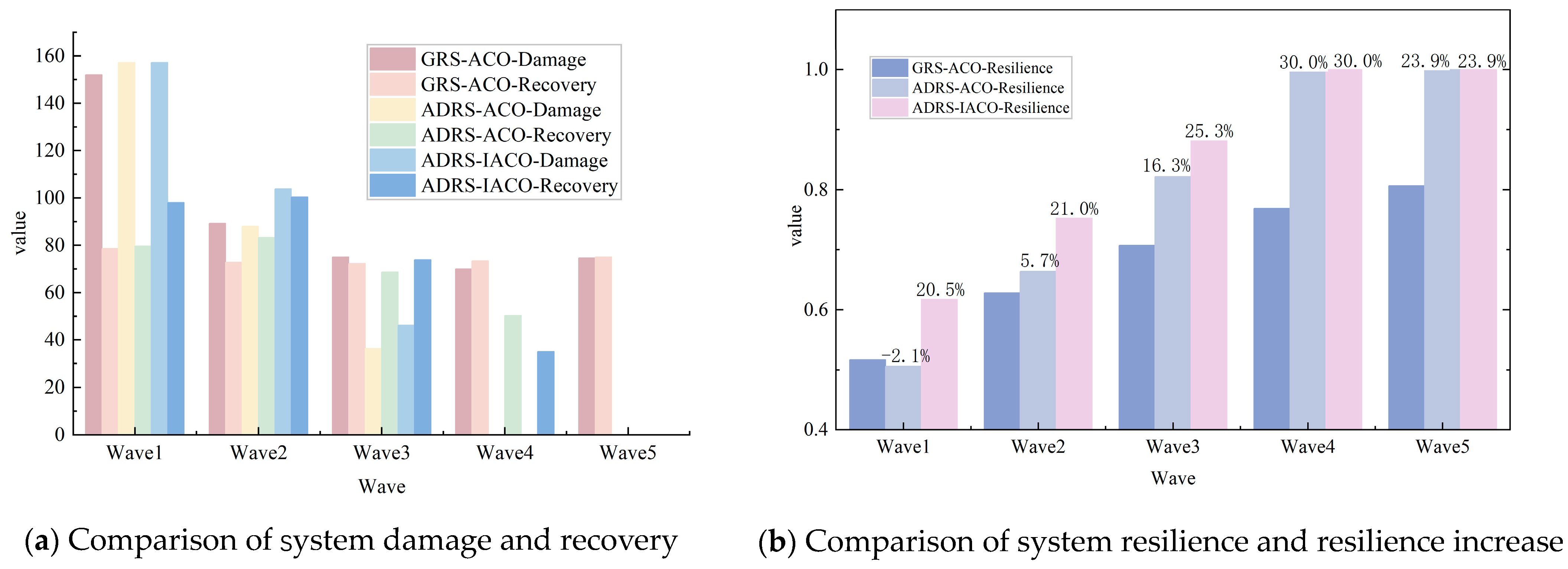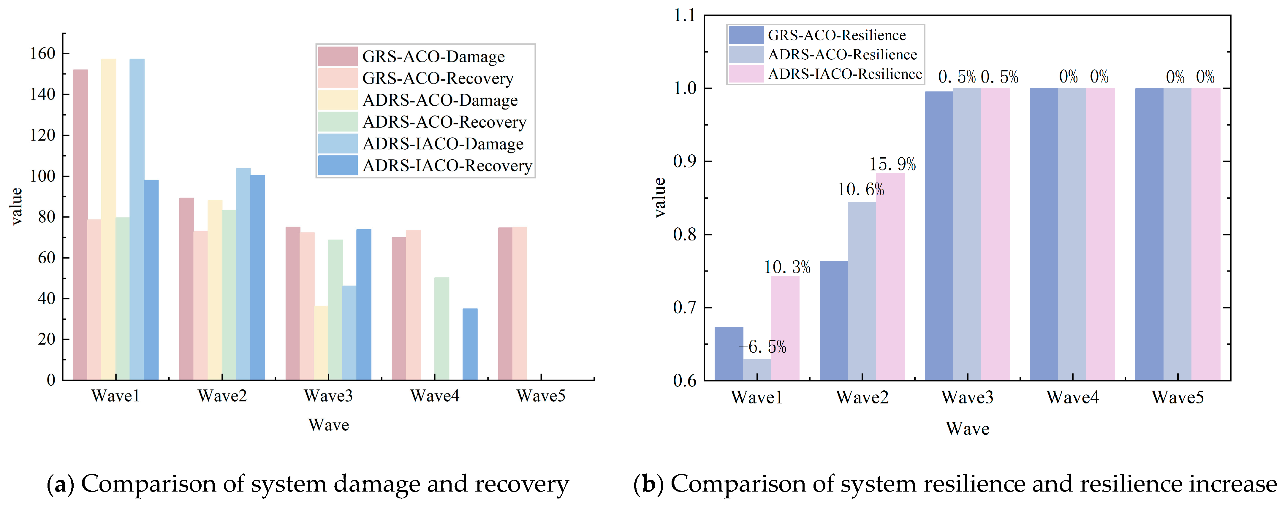 Compared to the GRS-ACO, the two strategies based on ADRS demonstrated superior recovery capabilities and accelerated system repair processes in the first two waves. In the first wave, the system damage values for all three algorithms were 107.8. However, ADRS-IACO exhibited the highest recovery value (80.0), significantly outperforming ADRS-ACO (67.8) and GRS-ACO (72.6). In the second wave, the system damage values for the two ADRS groups (54.0 and 54.8, respectively) were notably lower than that of the GRS-ACO group (76.2). After the third wave, all three algorithms achieved zero system damage, effectively fulfilling the defense mission.